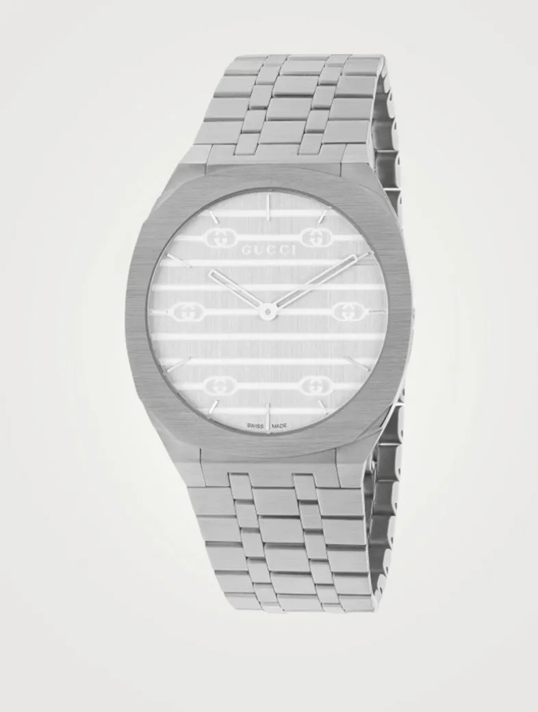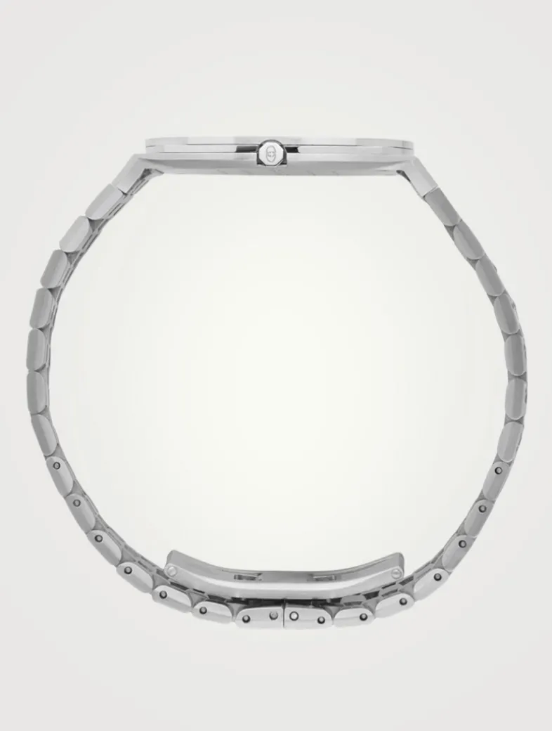 Crafted in stainless steel, this round face watch is designed with a multilayered case. The Swiss-made bracelet watch is finished with a silver brass dial with GG detailing and five-links strap.