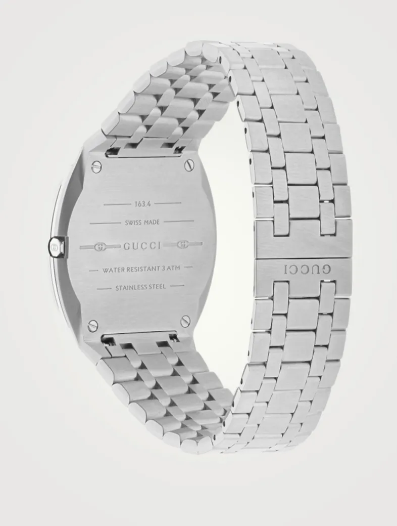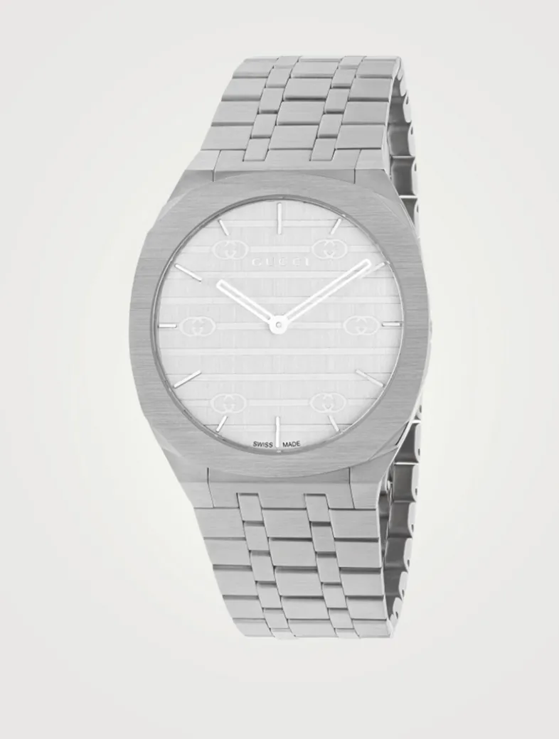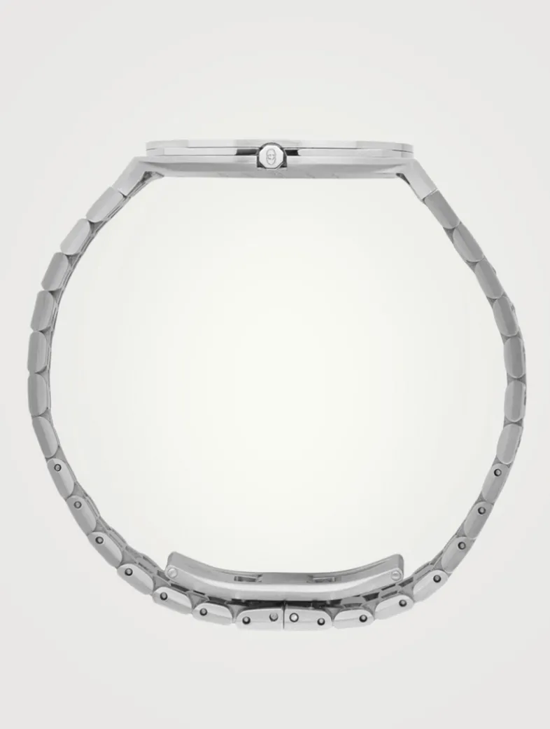 Crafted in stainless steel, this round face watch is designed with a multilayered case. The Swiss-made bracelet watch is finished with a silver brass dial with GG detailing and five-links strap.