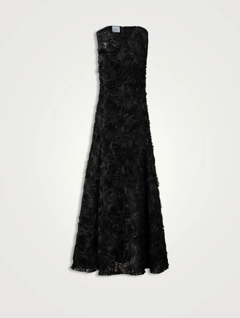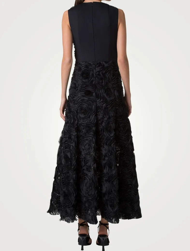 Exuding a romantic elegance, this sleeveless dress is adorned with delicate tulle carnation embroidery, lending a touch of whimsy to the piece. It has a fitted bodice with a smooth back panel and a flared ankle-grazing skirt.