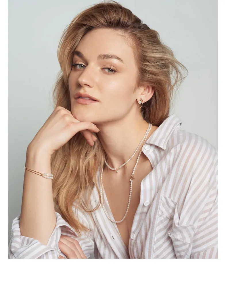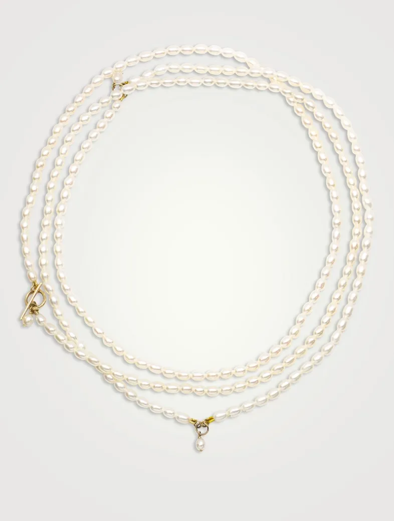 With the option to wear as a triple choker to one long strand, this 40-inch long keshi pearl necklace with a 14k gold toggle closure is endlessly versatile. Handcrafted in Vancouver.