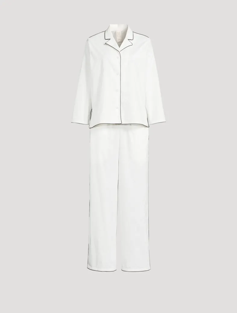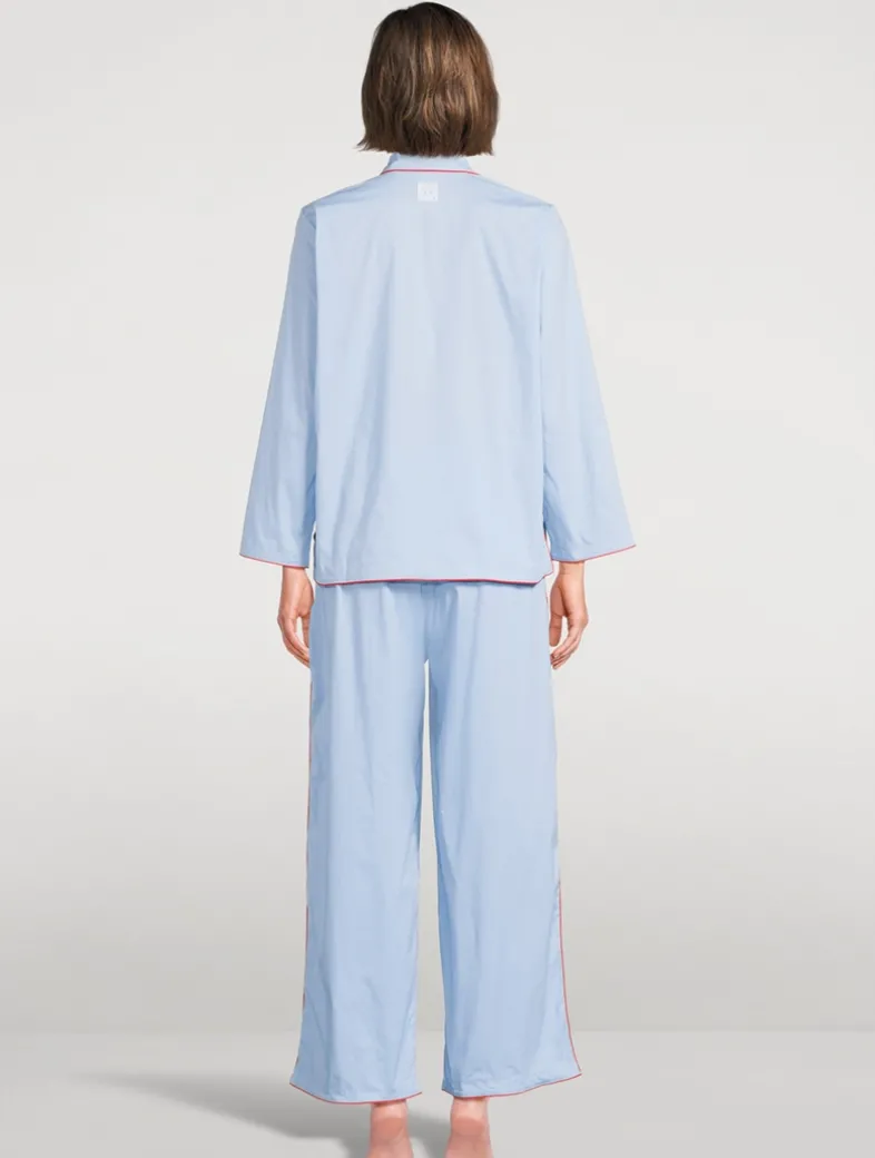 The 402 Long Set features a thoughtfully lengthened shirt that falls below the hips, complete with side seam vents for added comfort and easy pocket access. Designed with long sleeves and a four-button front closure, it pairs perfectly with the relaxed, straight-leg 402 trousers—full-length with a slightly higher elasticated waistband and deep side pockets. Signature brand labels also serve as convenient hanging loops. The cotton stretch fabric is a soft, breathable cotton-elastane blend chosen for its crisp, durable, and flexible feel—like slipping into fresh cotton sheets.