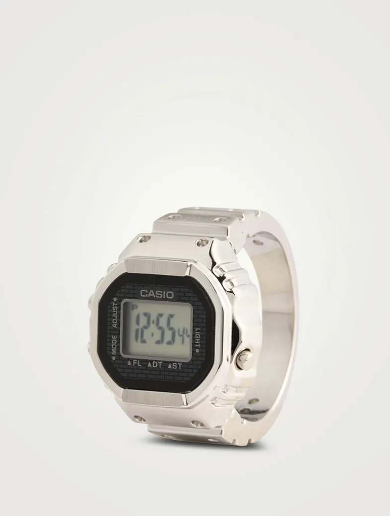 To celebrate 50 years of Casio watches, Casio reintroduces its first-ever ring watch—a playful yet practical digital timepiece miniaturized with advanced metalworking and MIM (Metal Injection Molding) technology. Made from a single piece of metal with water-resistant sealing, it features a 7-segment LCD displaying time, date, dual time, and stopwatch, plus a subtle flashing light as a nod to the fleeting nature of time. Sized to fit a US 10.5 (EU) ring with two included spacers, it’s powered by a downsized module and button battery—all in a sleek, full-metal ring.