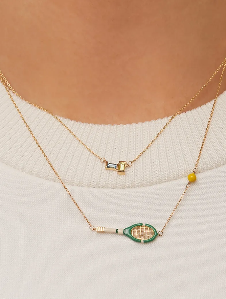 Set on an adjustable rolo chain, this necklace is adorned with a handpainted enamel tennis racquet and an Aliita tennis ball.