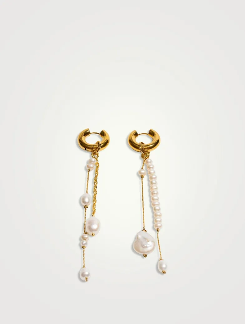 Intentionally mismatched, these thick huggie hoop earrings are adorned with long dangly removable pearl chain charms.