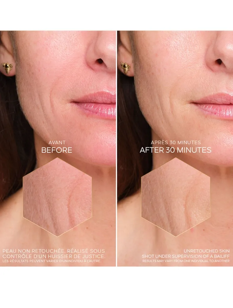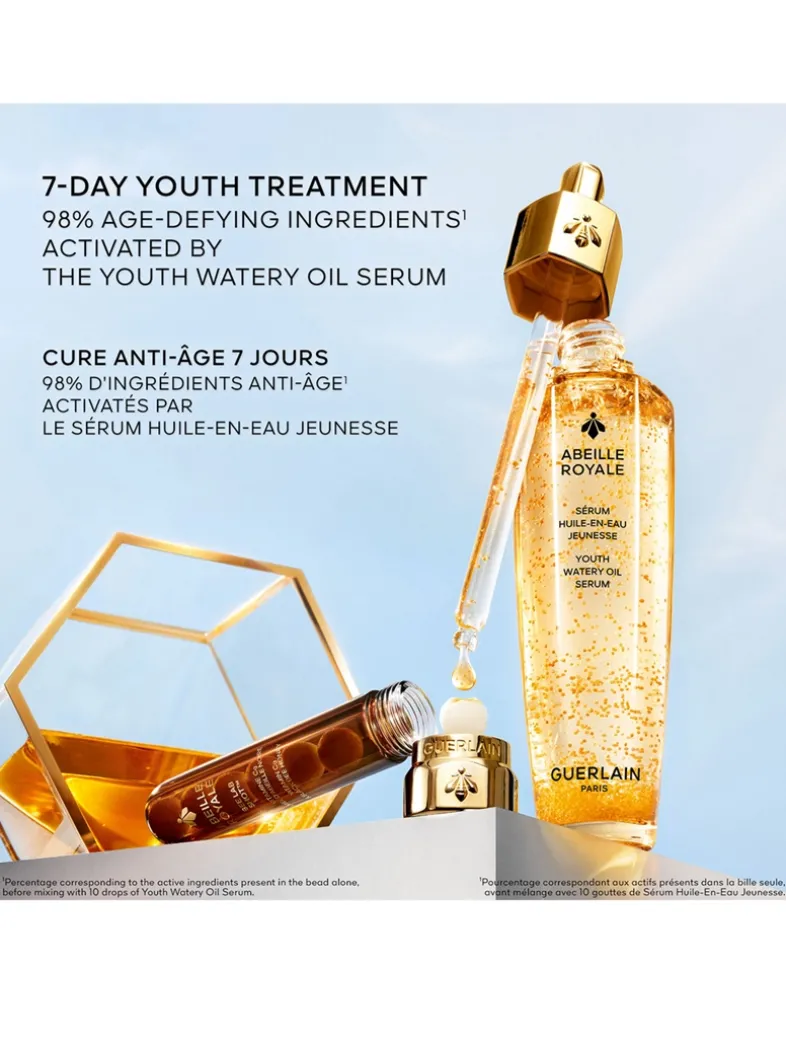 Often overtaxed, skin suffers from periods of tiredness or intense stress, during which it is in particular need of repair. Bee Lab Shot, a 7-day intensive treatment with crystallised spheres made up of 98% age-defying ingredients, is blended with Youth Watery Oil Serum to repair skin and correct the signs of aging from the first dose: skin is visibly fresher and brighter, wrinkles are filled in. After seven days, it is visibly transformed, deep wrinkles are corrected.