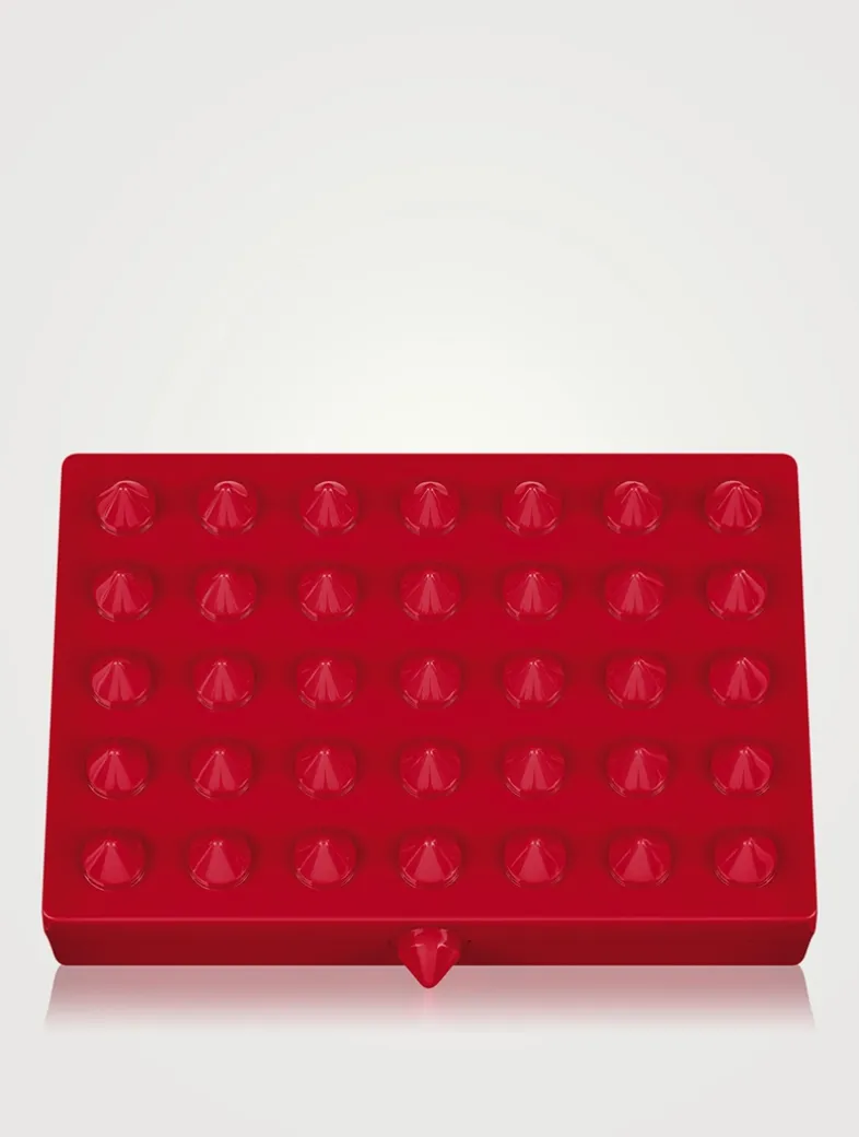 Its nomadic tone-on-tone red case, dressed with Louboutin signature spikes, features a large mirror and a double-ended brush applicator: a foam tip to apply, and a brush with soft synthetic bristles to blend.