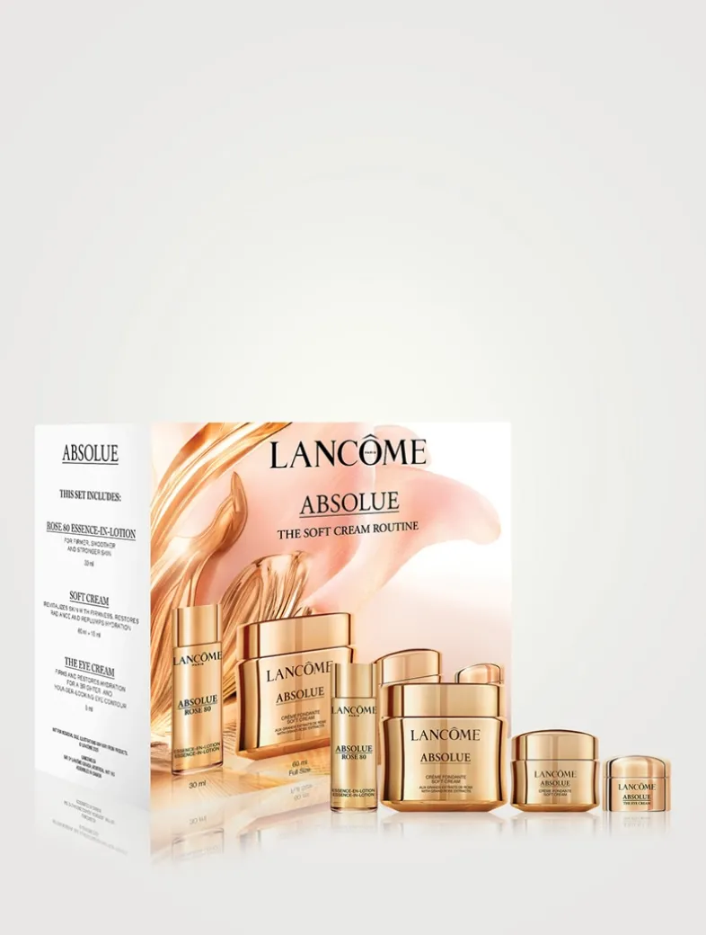 The Lancôme Absolue Soft Cream Gift Set includes Absolue Regenerating Soft Cream – Refillable (60 ml), Absolue Rose 80 Essence-in-Lotion (30 ml), Absolue Regenerating Soft Cream (15 ml), and Absolue Revitalizing Eye Cream (5 ml).