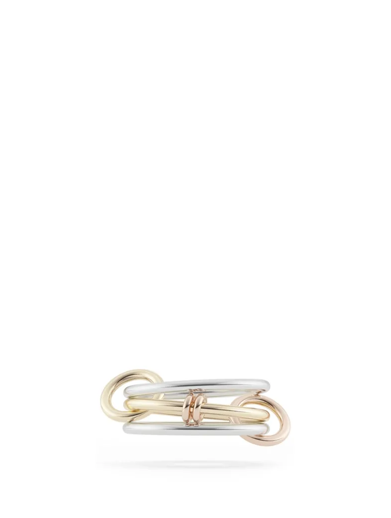 A signature stacked design, this piece features three linked rings in sterling silver and yellow gold with mixed gold connectors and rose gold annulets.