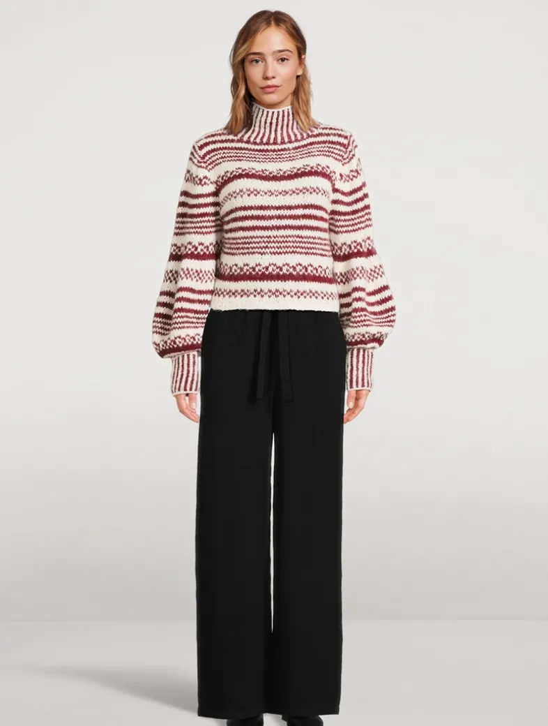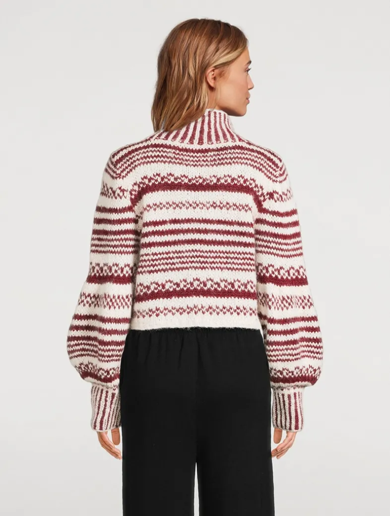 Crafted by skilled artisans in Peru, this luxurious high-neck sweater features elegant billowed sleeves and is developed using an intricate intarsia technique. Each piece is handknit with care, honouring traditional craftsmanship.