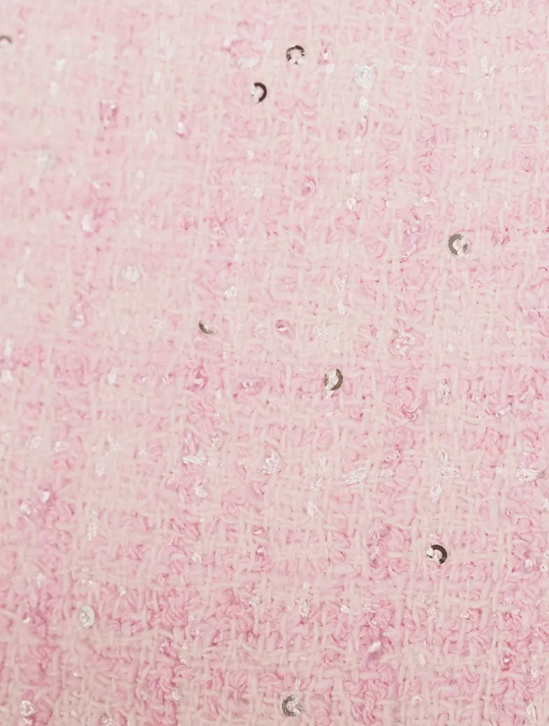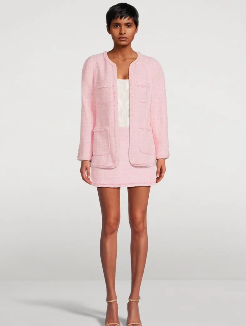 A LoveShackFancy take on a ’60s-inspired style, this preppy tweed skirt channels New York’s Upper East Side with a polished and tailored silhouette. This mod mini features sequins woven throughout for extra shimmer all over. Patch pockets adorn the skirt with a frayed detail for a playful finish.