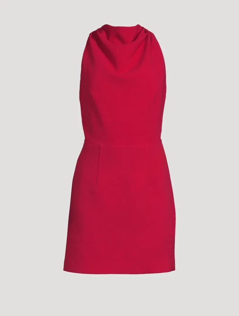 Cut from bonded crepe, this fitted dress is designed with a sophisticated halter cowl neckline, that twists into an elegant racerback. The A-line mini skirt traces a chic silhouette, accentuated by a cinched waist.