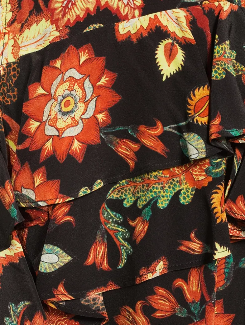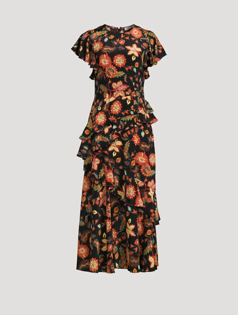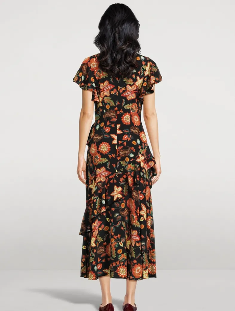 The Amaia Dress is richly patterned with florals rendered from a custom, hand-painted artwork created by a master textile artisan in India. Using an ancient hand-painting technique, botanical dyes are applied one colour at a time with meticulous attention to detail, then thoroughly dried and washed before painting the next colour—a multistep process that magnifies the organic beauty of the natural pigments. Crafted from luxe crêpe de chine, this multi-hued frock has fluttering sleeves and tiered ruffles that cascade from the waist.