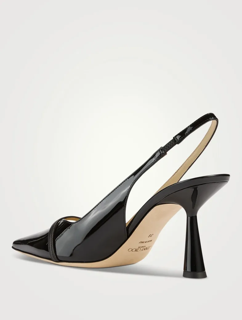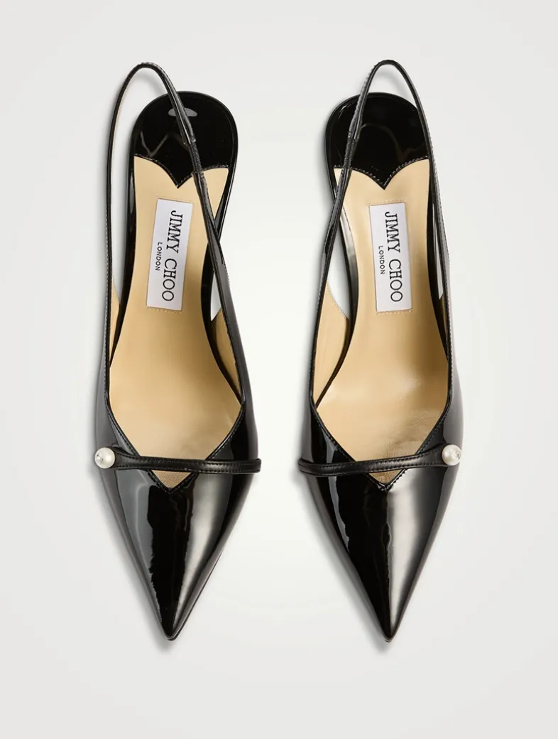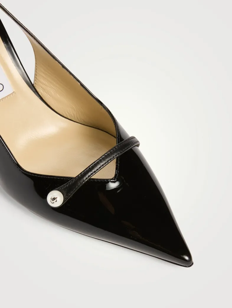 Chic and feminine, the Amita pumps are Italian-crafted in glossy patent leather. The pointed-toe style sits on 85mm heels and is detailed with a light-catching JC pearl button at the top strap.