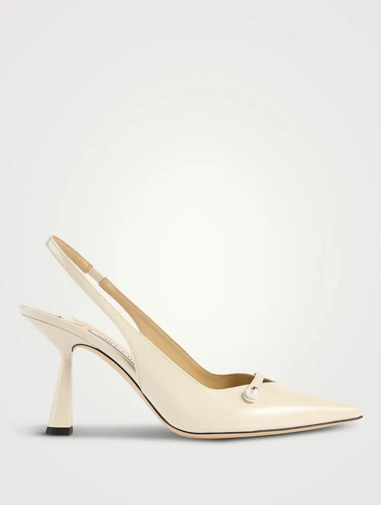 Chic and feminine, the Amita pumps are Italian-crafted in glossy patent leather. The pointed-toe style sits on 85mm heels and is detailed with a light-catching JC pearl button at the top strap.