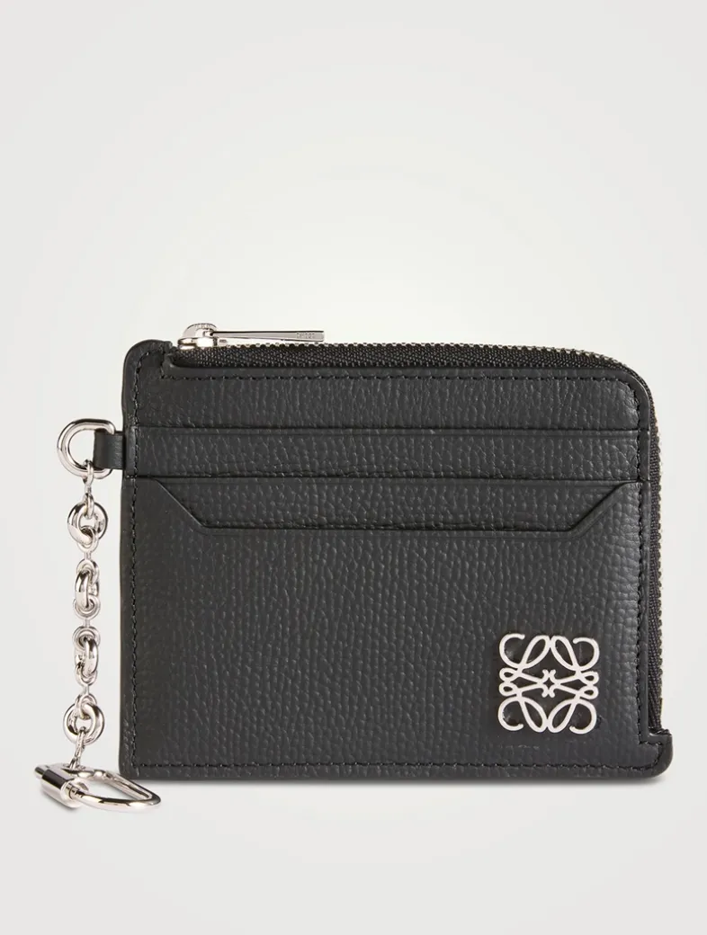 This slim case is crafted in pebble grain calfskin with metal Anagram embellishment. It is designed with a zipped coin purse, six card slots and a key hook and chain.