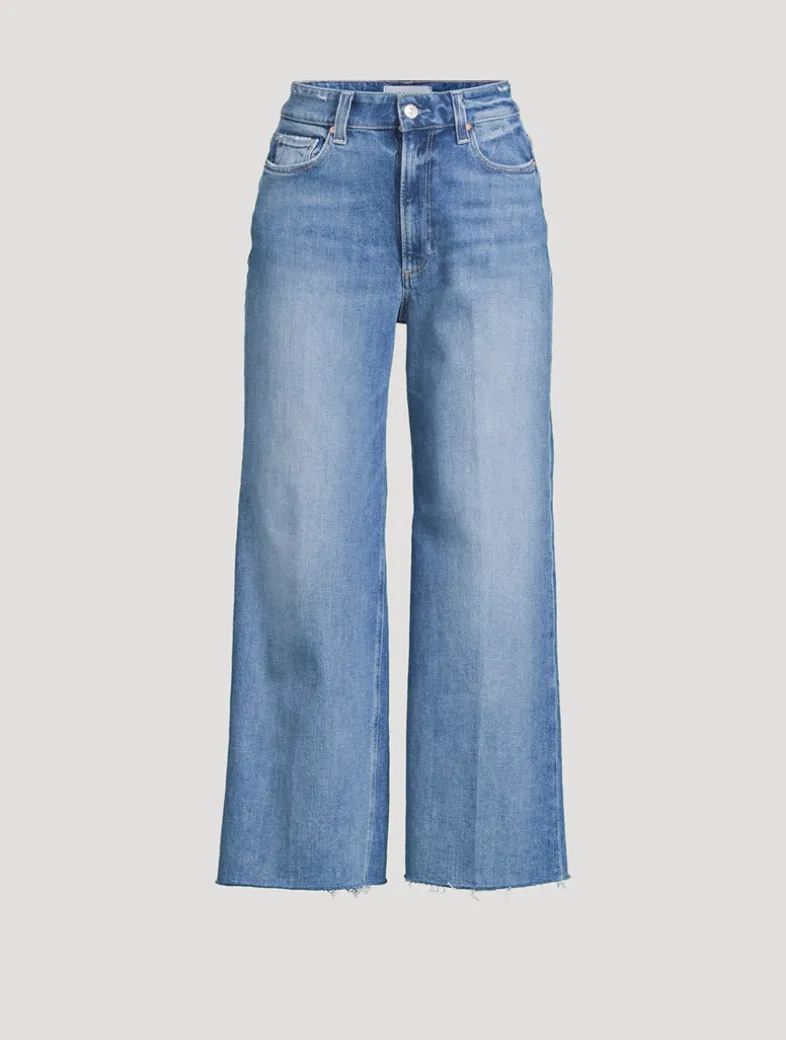 This high-waisted wide leg has a slightly relaxed fit and an ankle-length silhouette. This style comes in a lived-in wash with whiskering, fading, and a raw hem. Cut from VINTAGE denim, this effortlessly cool pair has the look of authentic vintage denim but is incredibly comfortable with stretch and recovery.