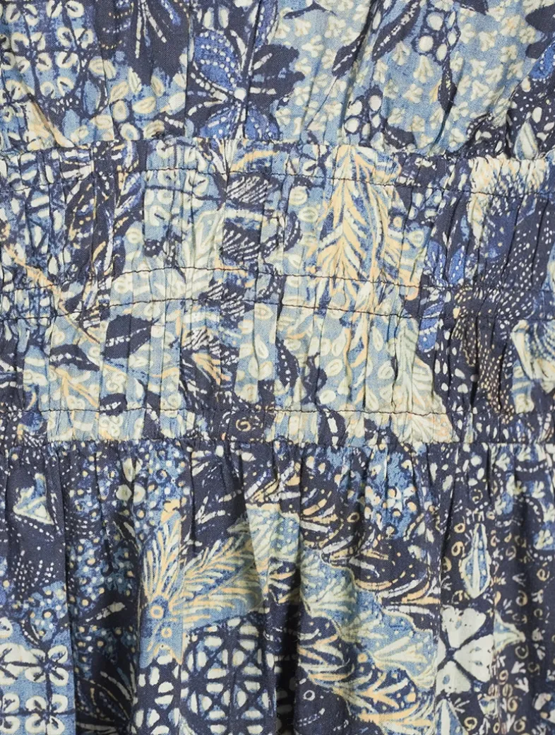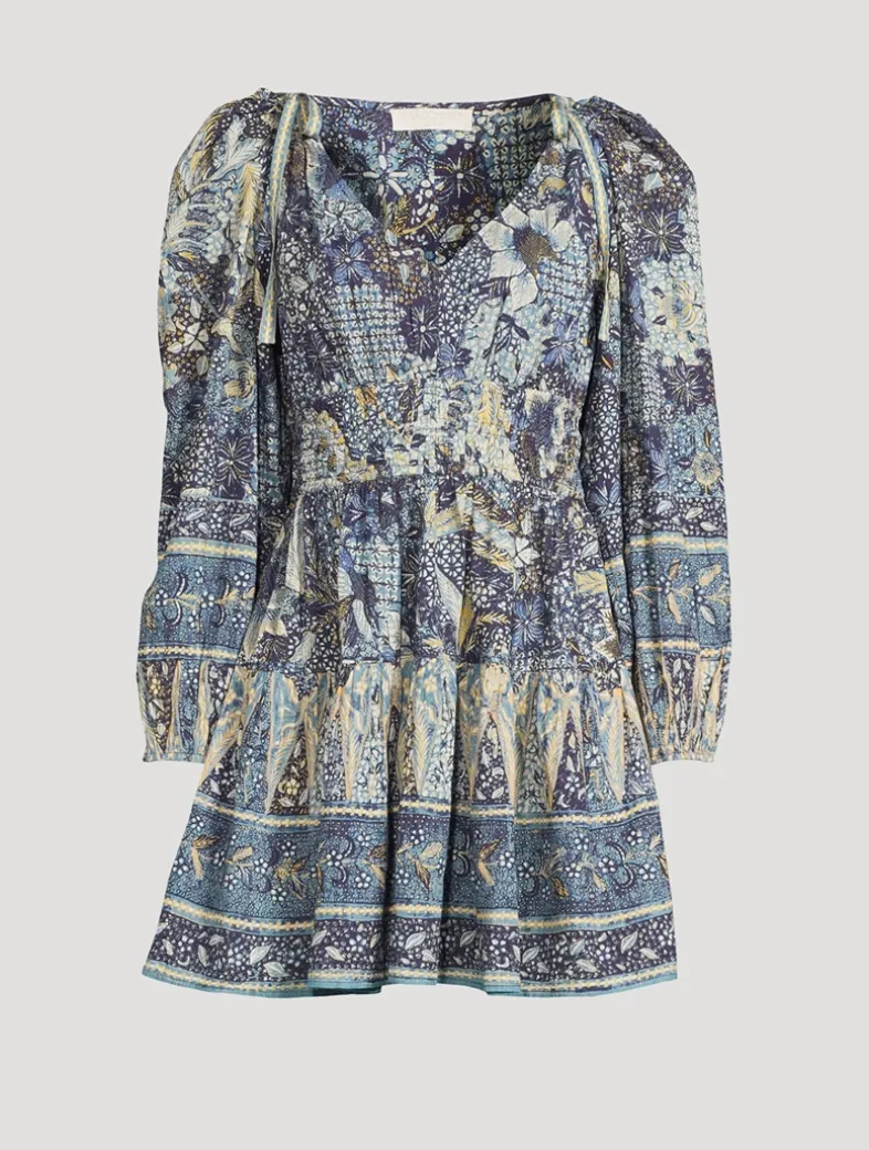 The Anika Dress is exquisitely patterned with botanicals inspired by a vintage batik print, uniquely layered atop softly striped graphics. Arriving in a lightweight cotton blend, this mini dress has fixed bows at the shoulders, an elastic waist, and is full of elegant volume at the long sleeves and mini hemline. It has side pockets and fastens with a concealed side zipper.