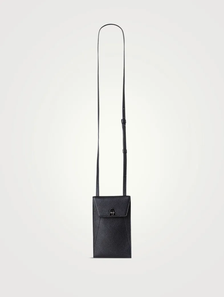 Crafted of a cervocalf leather, this crossbody pouch is designed with an adjustable leather strap, signature trapezoid turn lock, and three credit card slots to keep your essentials and phone secure.