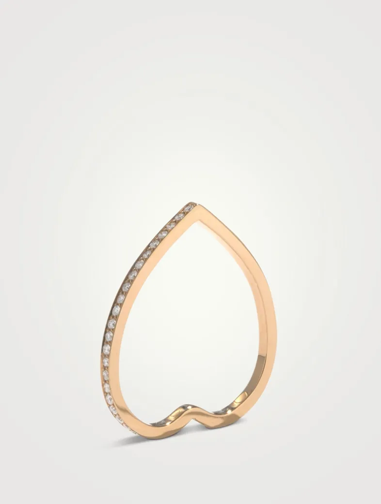 Antifer refers to a simple line forming a strong peak, architecturally stacked in an asymmetrical rhythm to suggest a cliff. This heart-shaped ring is cast in Italy from 18k gold and set with diamonds.
