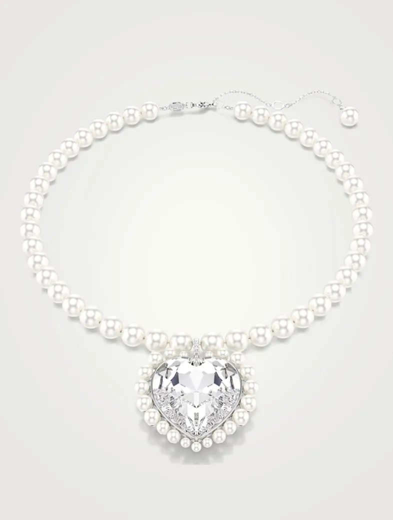 Co-created with Ariana Grande and Swarovski Global Creative Director Giovanna Engelbert, this capsule collection celebrates the love of music and the art of timeless style, combining spellbinding savoir-faire with contemporary cool. This rhodium plated design uses Swarovski Crystal Pearls to maximum effect, placing them around the necklace itself, and also in different sizes around the central heart-shaped crystal.