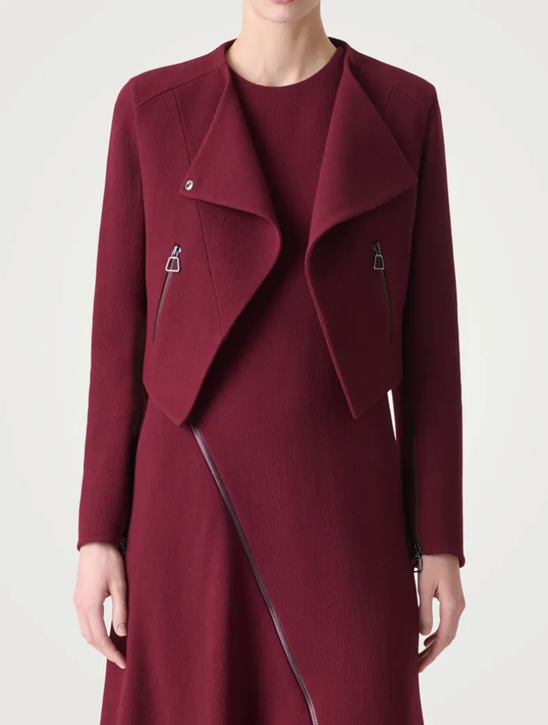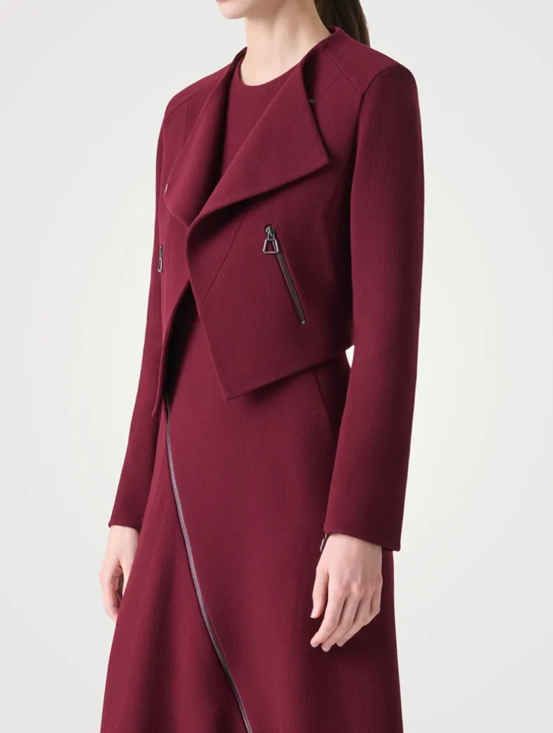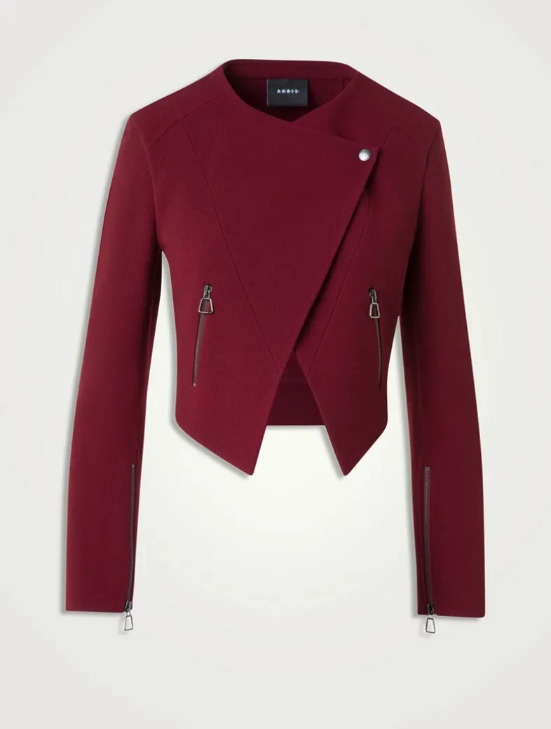 Nodding to moto-inspired styles, this cropped jacket has an asymmetric wrapped design closed with a single snap button. It has zippered pockets and zippered cuffs finished with Akris’ signature trapezoidal pulls.