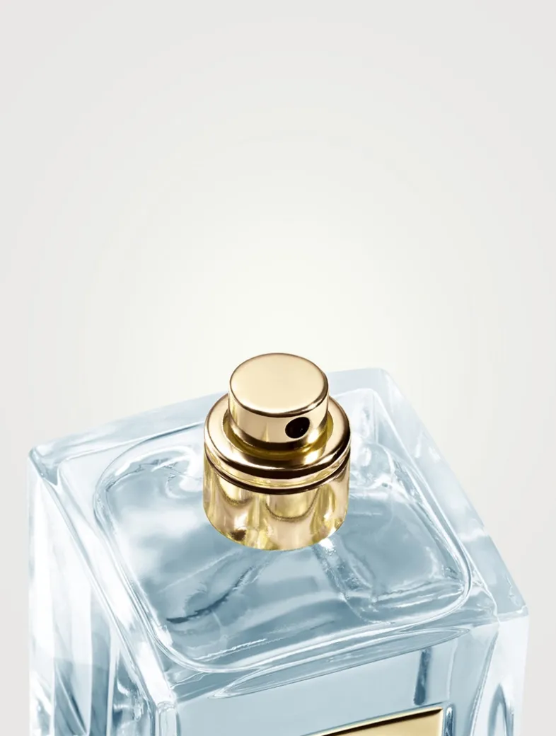 Iris Bleu is infused with a touch of blue reminiscent of the Mediterranean sky; the iconic Armani Privé bottle houses a captivating fragrance. Its transparent, square silhouette showcases the airy juice within. A black, stone-shaped cap and gold nameplate, etched in classic black lettering, complete the elegant design.
