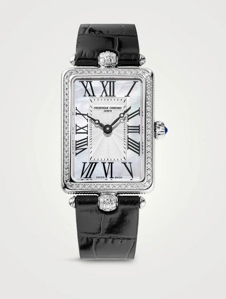 Decorating with 82 sparkling Diamonds, this timepiece features a white mother-of-pearl dial with guilloché decoration, black printed roman numeral indexes, stainless steel case and leather strap.