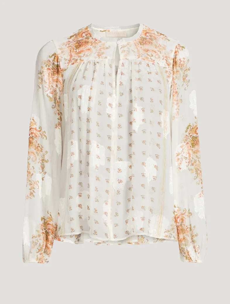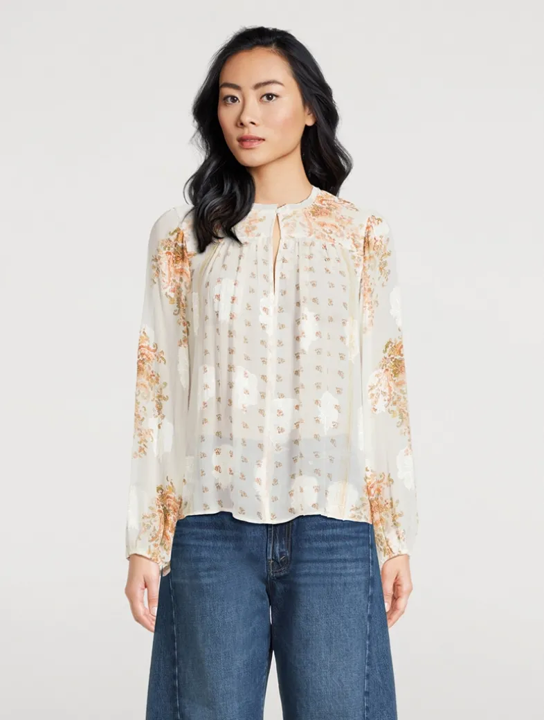 Delicate botanicals unfurl across the Aster Blouse, crafted of airy chiffon jacquard with an undertone of fil coupé florals. This romantic top is imbued with gentle volume and has long sleeves with elastic cuffs. It is unlined and fastens with a buttoned front keyhole.