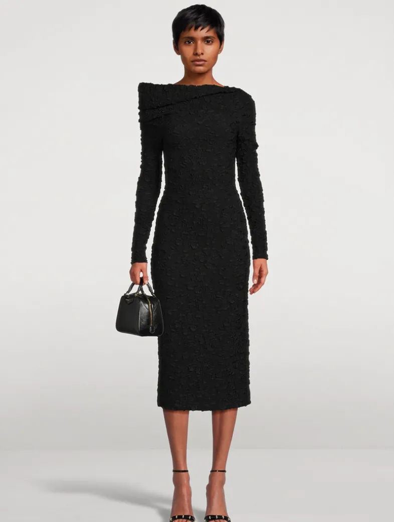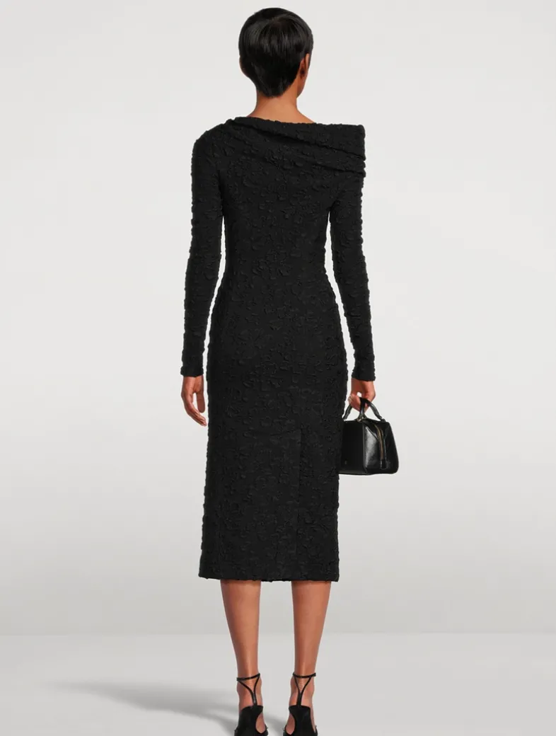 A textured floral motif lends a romantic touch to this cloqué cocktail dress. Framed by an asymmetric off-the-shoulder neckline, the long-sleeve midi has a slim fit finished with a small slit at the rear.