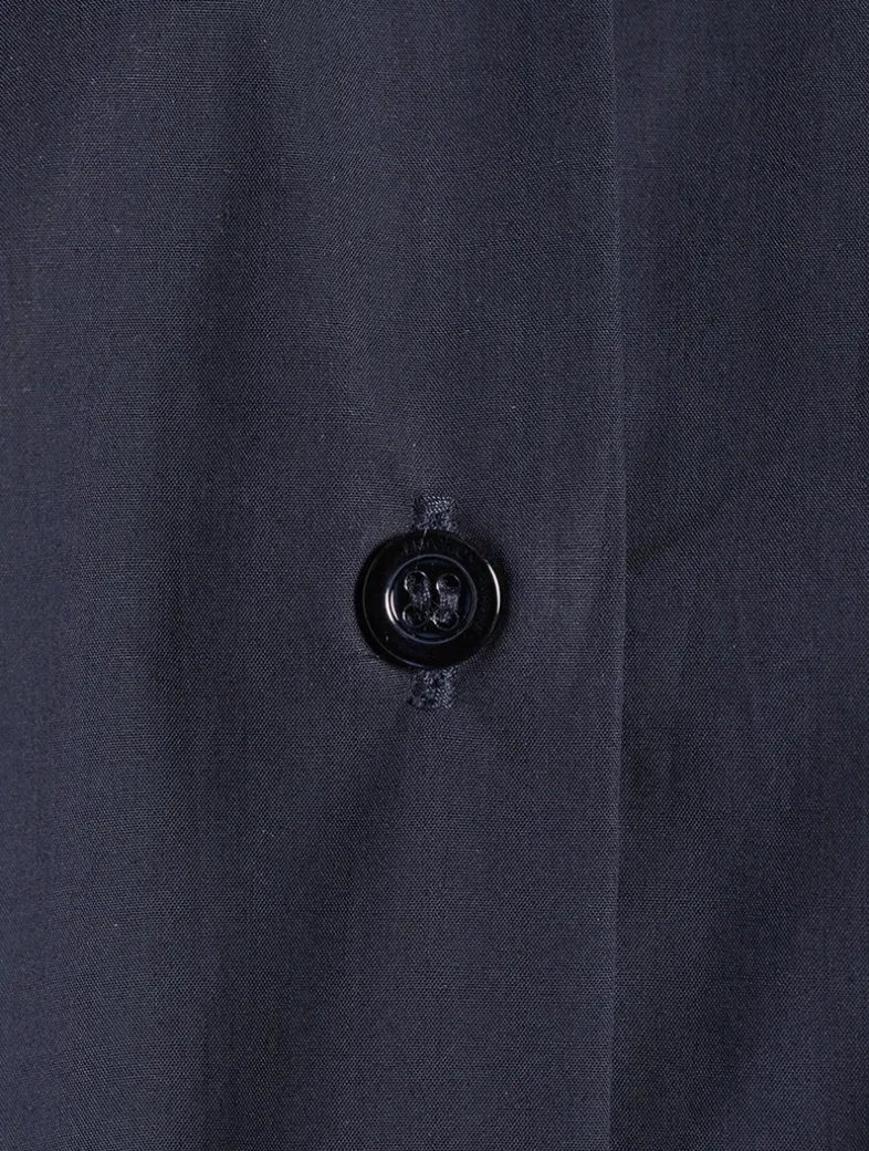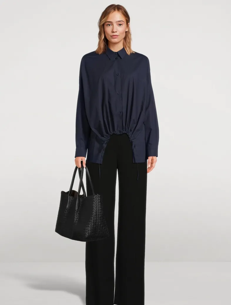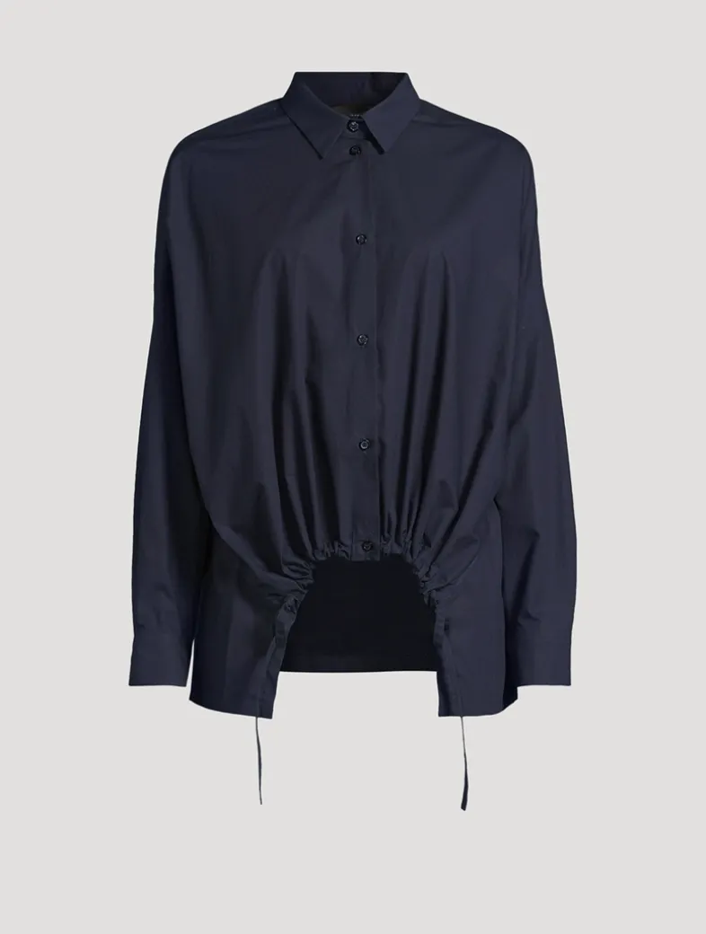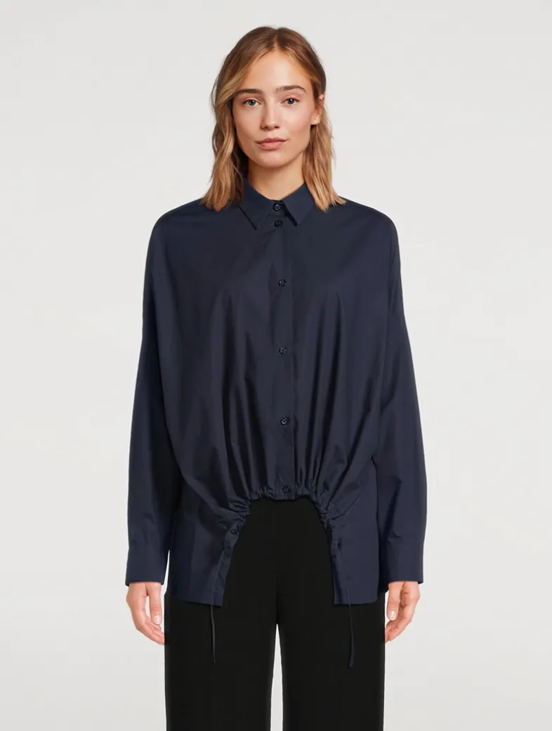 This crisp poplin shirt has a curved hem detailed with an adjustable drawstring. It has a pointed collar, long sleeves with buttoned cuffs, and a buttoned placket.