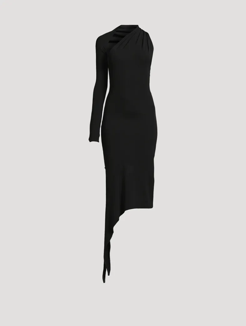 An asymmetric design define this chic midi dress. Crafted from jersey, it has a one-shoulder neckline, a single long sleeve, and a draped hem.