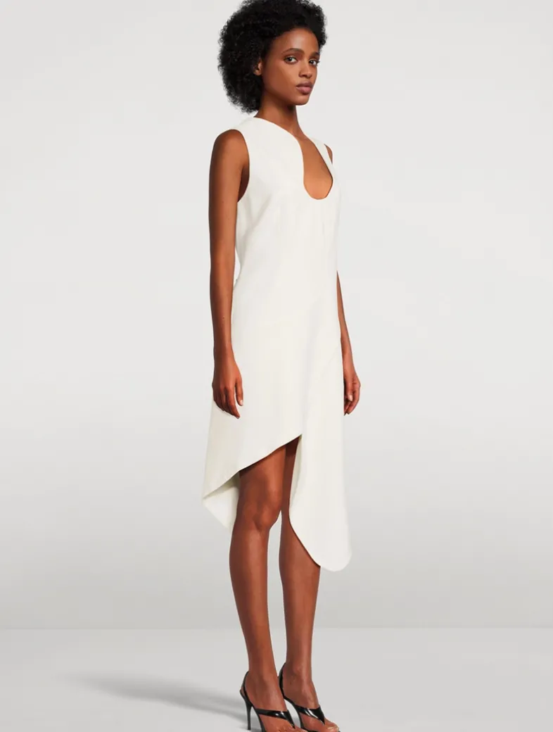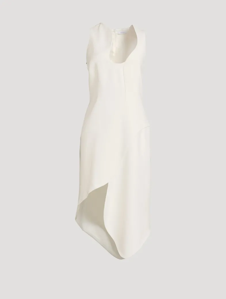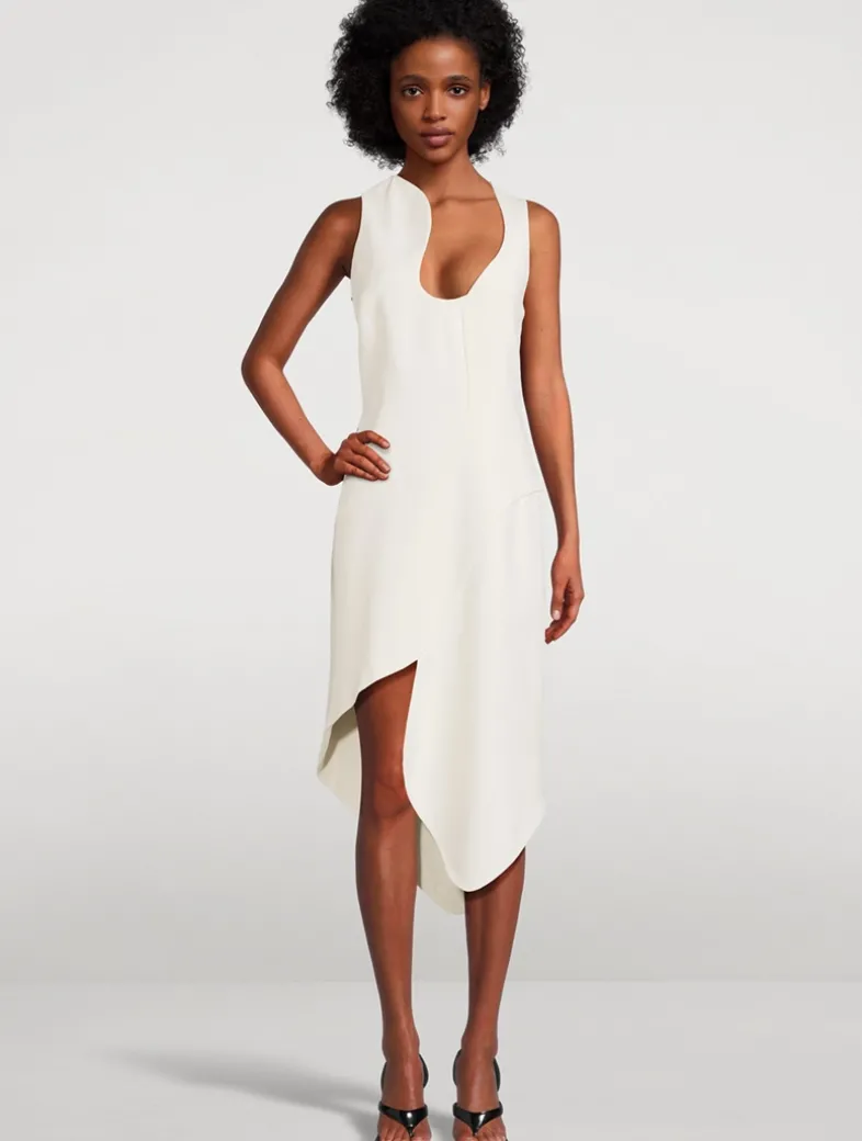 The contemporary sensuality of this dress is created by a series of curves that flatter and enhance the form. Made of pure stretch viscose, the smooth fabric fastens at the back via a hidden zip. Topped with a wave neckline and finished with an asymmetric, mid-length hem.