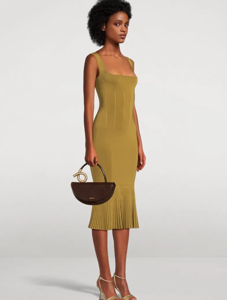 The Atalanta Dress’s ribbed and structured body is reflected in the flared and ribbed ruffle hemline, which ends just below the knee, while its décolletage is defined by GALVAN’s signature square neckline.
