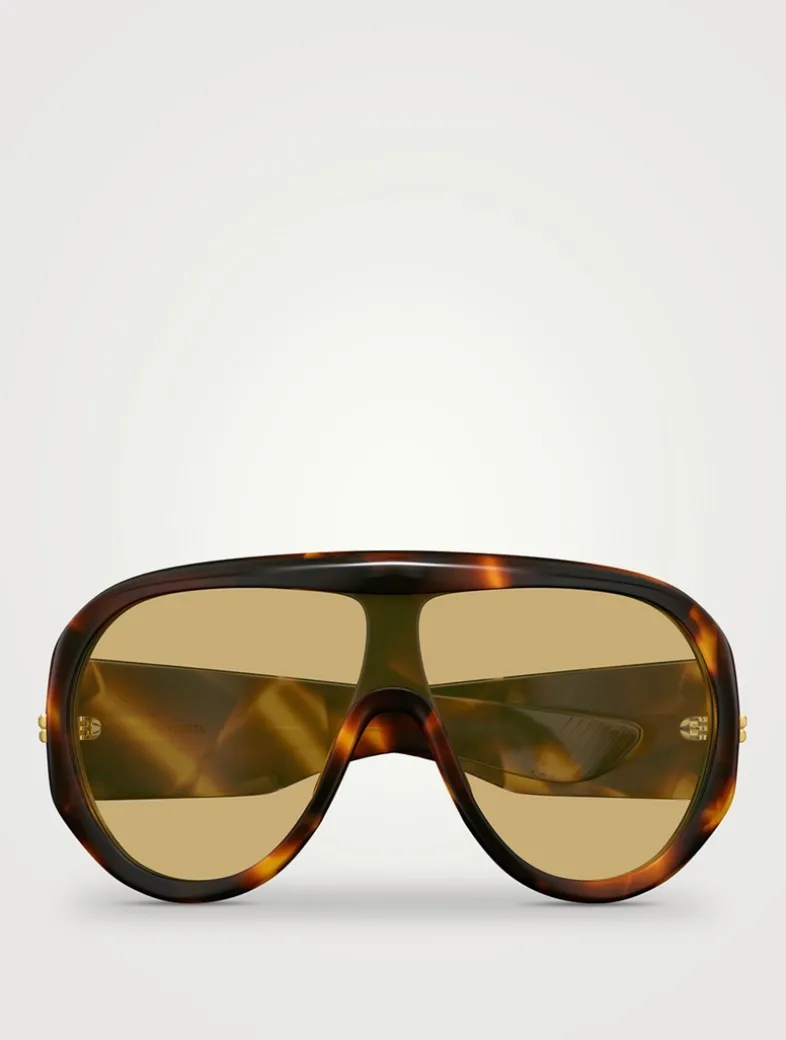 Crafted in Italy, this unisex style is designed with a bold aviator frame made from recycled acetate. The sunglasses are given a signature look the brand’s emblematic ribbon motif adorning the temples.
