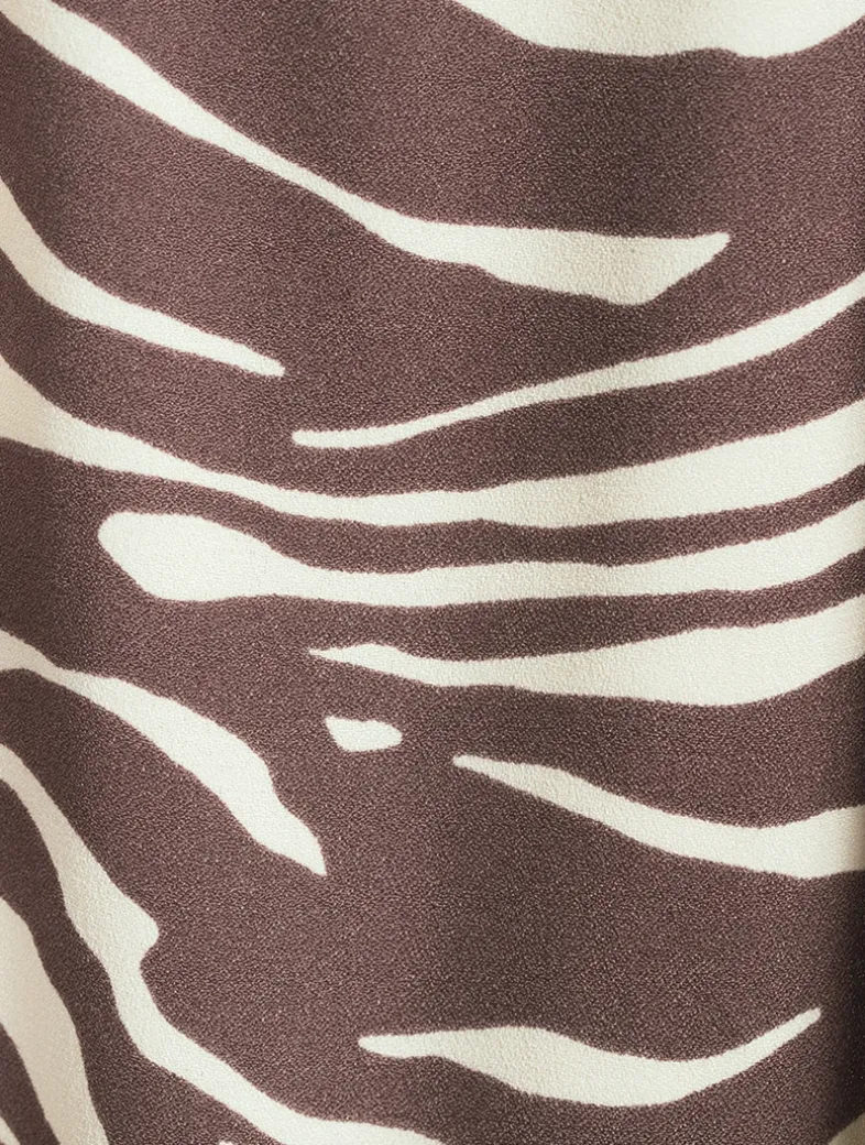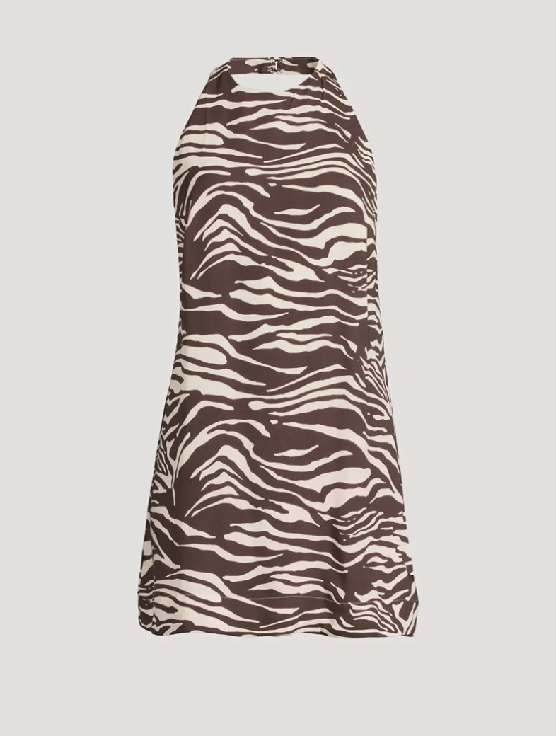 A striking zebra print lends a bold touch to this backless halter dress. Crafted from a lightweight drapey crêpe fabric with a dry hand feel.