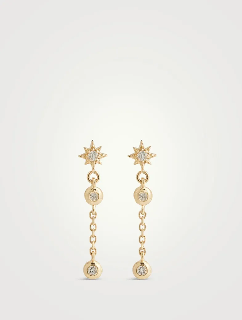 This single chain earring is designed to dazzle. It features a brilliant diamond encased in an eight point micro star, and round cut stones. Inspired by the Northern Star, this dainty earring is a great staple to layer to wear as a minimal piece.