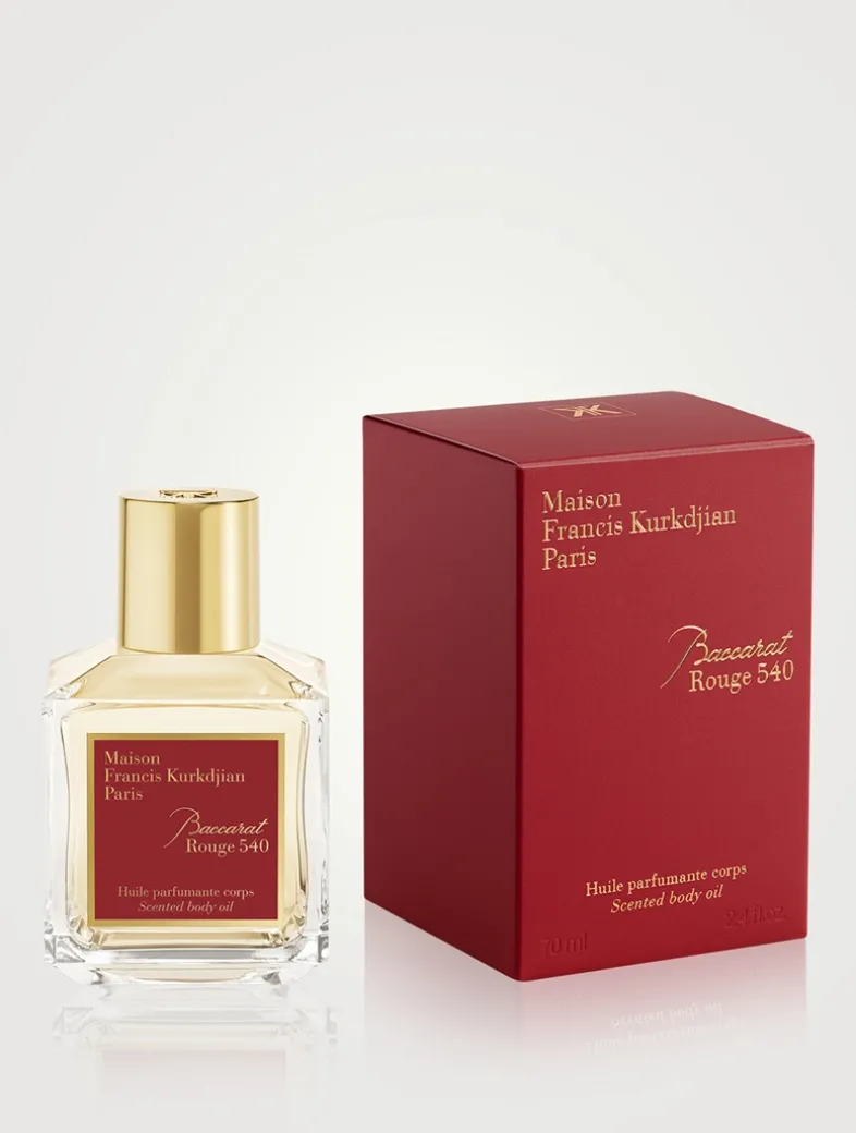 Baccarat Rouge 540 scented oil, held in the House’s iconic glass bottle, is composed of sweet almond, macadamia, virgin argan and apricot kernel oils.