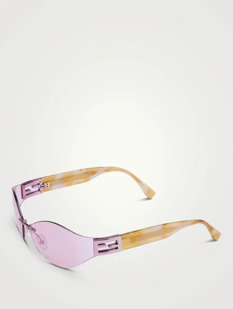 An evolution of the iconic baguette family, featuring the notorious baguette logo on the side. Inspired by vintage Fendi eyewear, modern meets vintage in the wrap-around rimless lenses, joining the acetate temples.