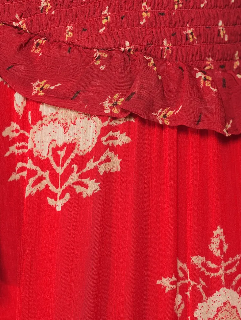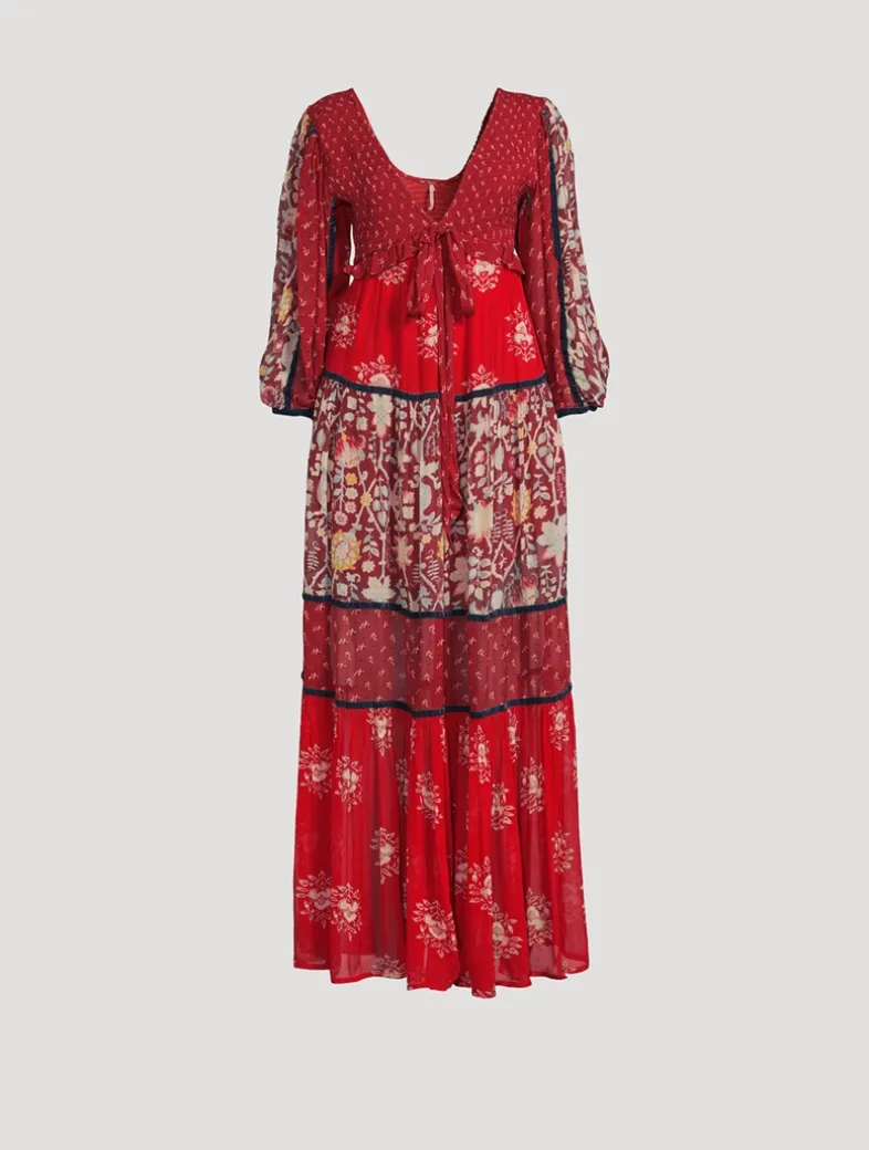 Elevated and beautifully printed maxi dress flaunting a mix of floral design. It has a smocked bodice and a plunging V-neckline framed by puffed sleeves with elastic cuffs.