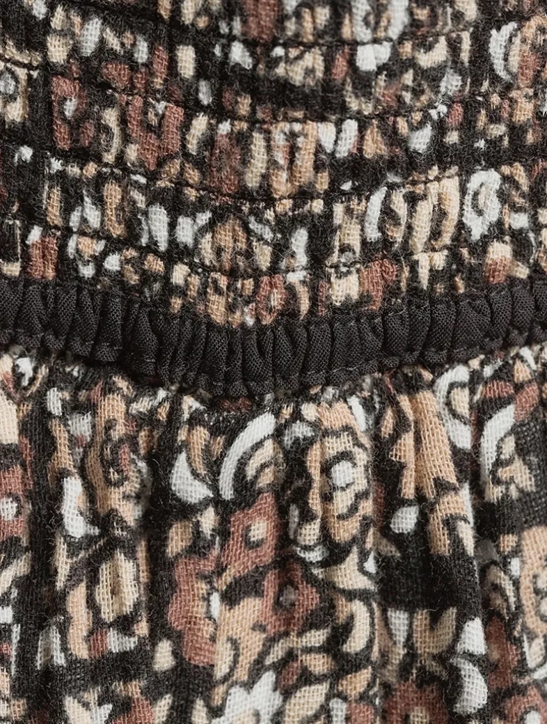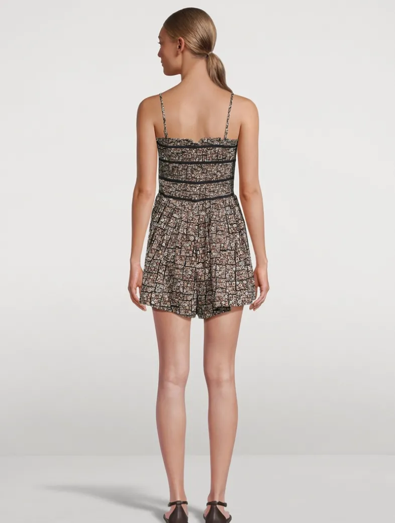 Femme and flattering, this romper is featured in a printed cotton fabrication with a smocked bodice and gathered shorts. Its square neckline is framed by thin adjustable shoulder straps that can be removed to create a strapless look. Certified to the Better Cotton Initiative (BCI) (>50% On-Product Mark).