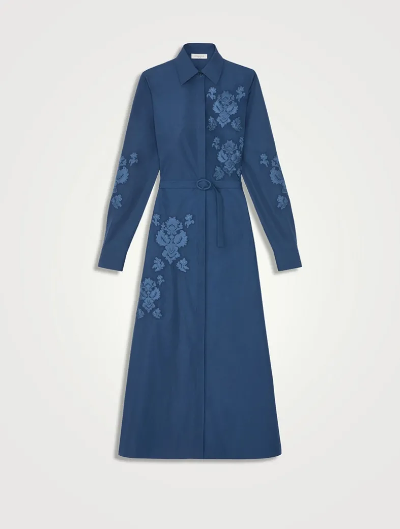 This crisp cotton poplin shirt dress is a blank canvas for dimensional Baroque embroidery. The relaxed silhouette, cinched with a matching fabric belt, is balanced by a high shirt collar and concealed button placket and cuffs.