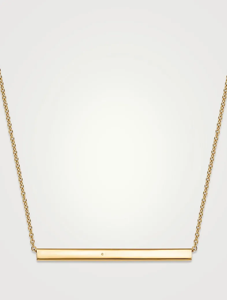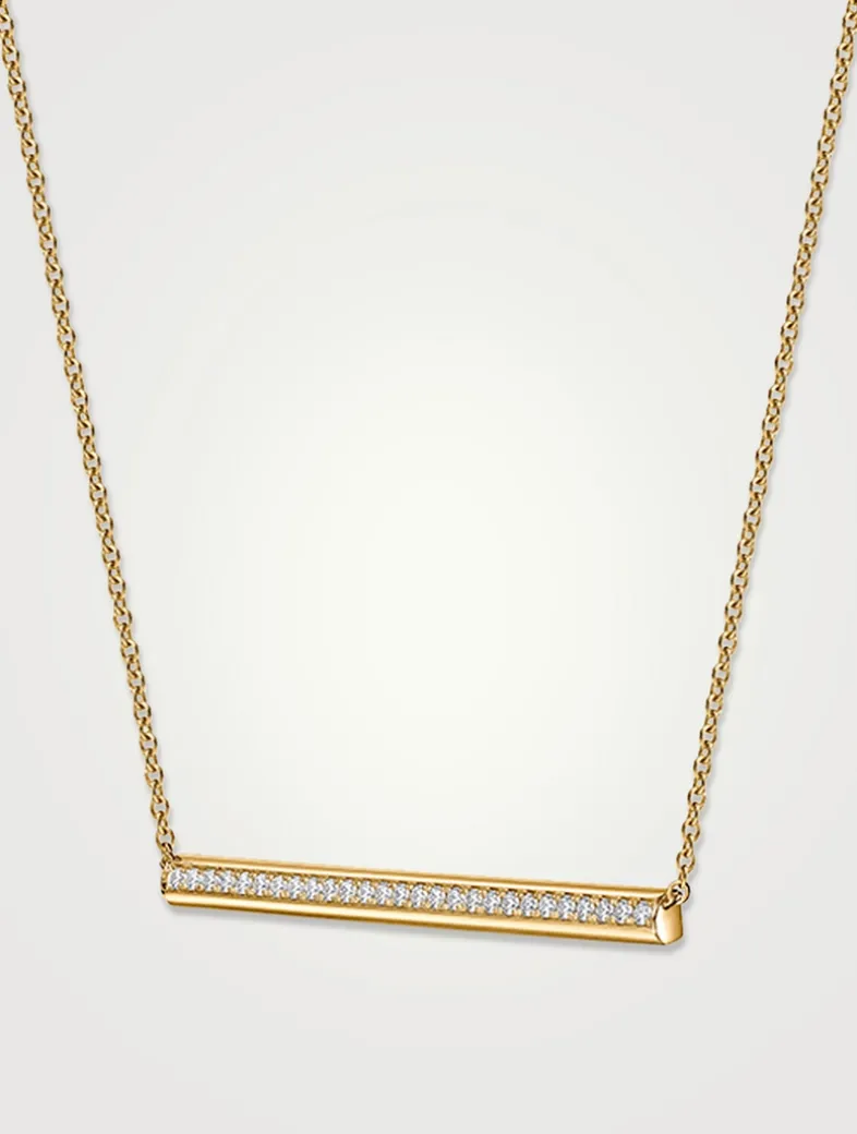 Made from 18k gold, this graphic horizontal line pendant is accented by a trail of pave set diamonds to make a subtle statement.
