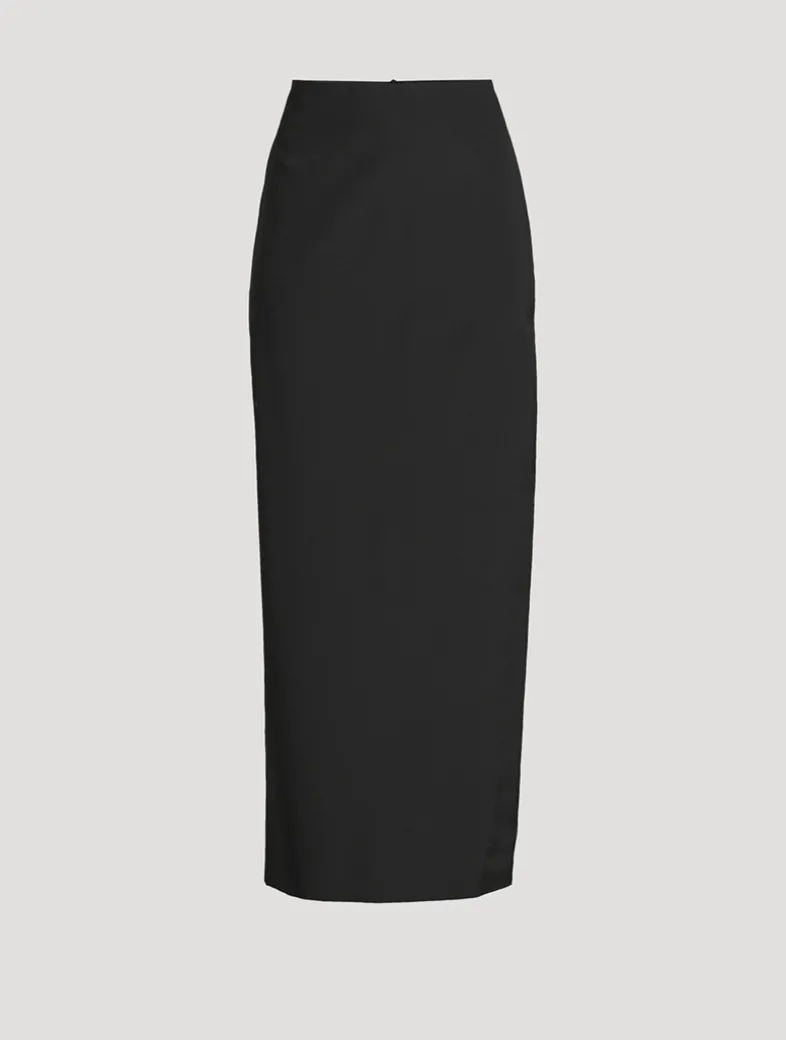 This calf-length pencil skirt in silk-wool has a slightly rounded hip and centre back slit detail.