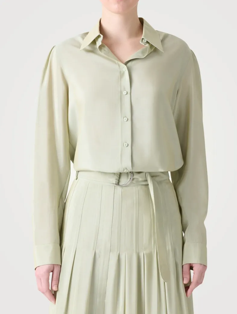 This long-sleeve shirt is made from a viscose-blend batiste fabric with a subtle sheen. It has delicate gathering at the shoulders, a buttoned closure, and buttoned cuffs.