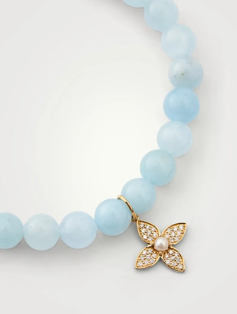 This semi-precious beaded bracelet, strung with polished stones, features a 14K yellow gold flower charm encrusted with pavé diamonds and centred with a single pearl.