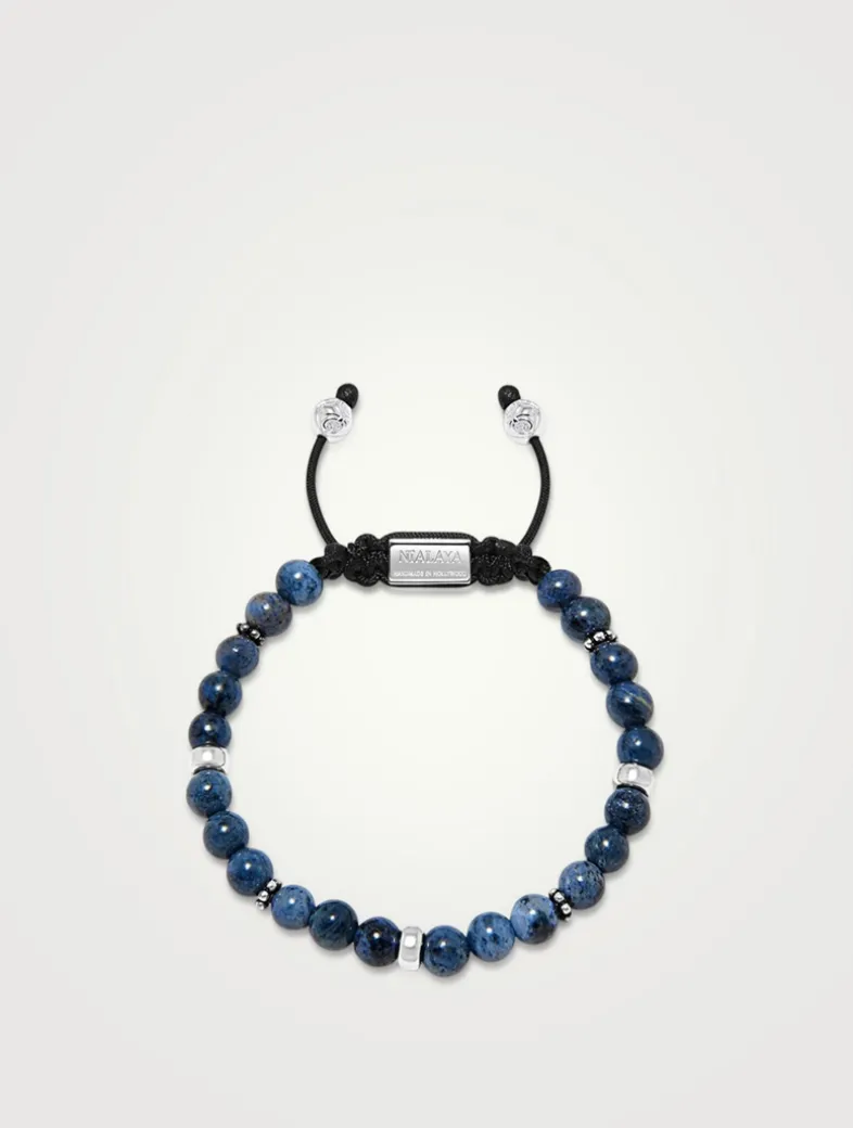 Showcasing polished blue beads, this bracelet is handcrafted using a strong 100% nylon string. Finished with a stainless steel drawstring lock, it can be adjusted by pulling the silver beads in opposite directions.