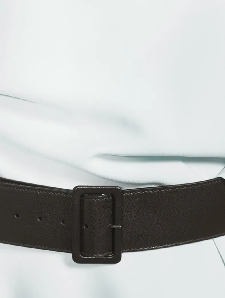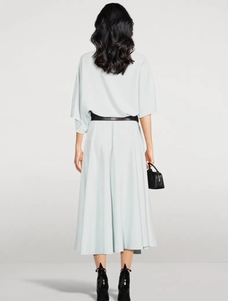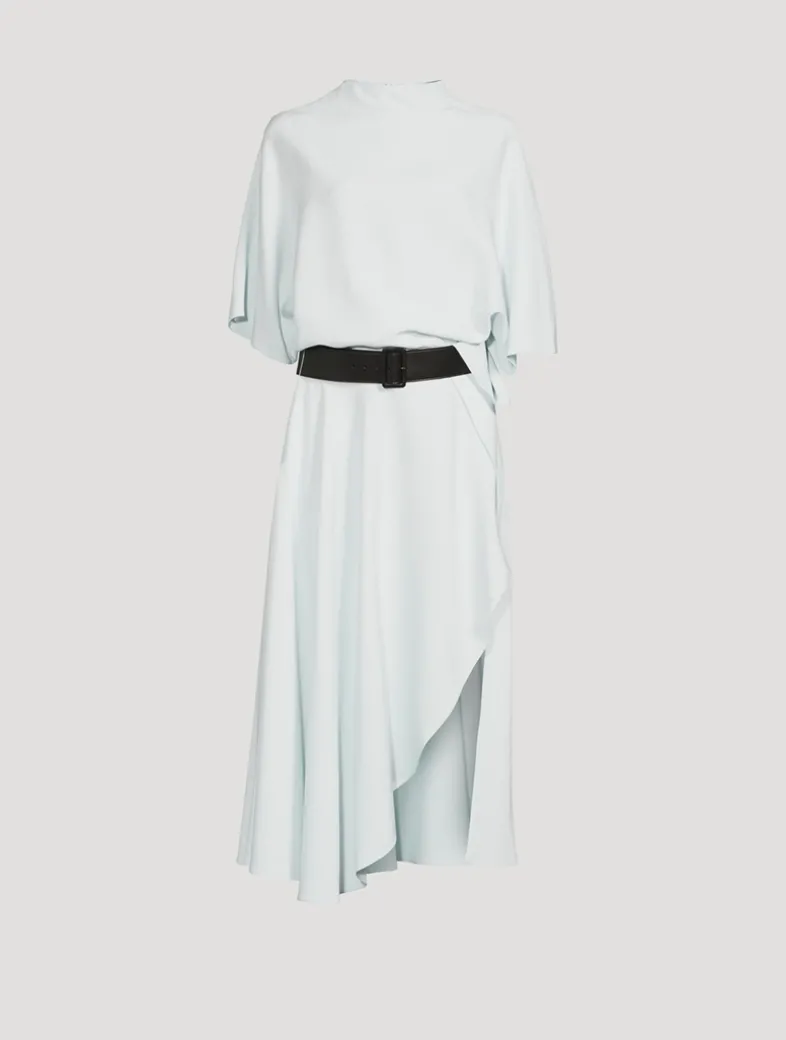 Flaunting an exquisitely draped design in fluid cady, this dress offers a relaxed take on glamour. Its bodice has a high neckline and fluttering sleeves, while the mid-length skirt has a wrapped front that reveals a hint of leg. A contrasting leather belt cinches the waist.