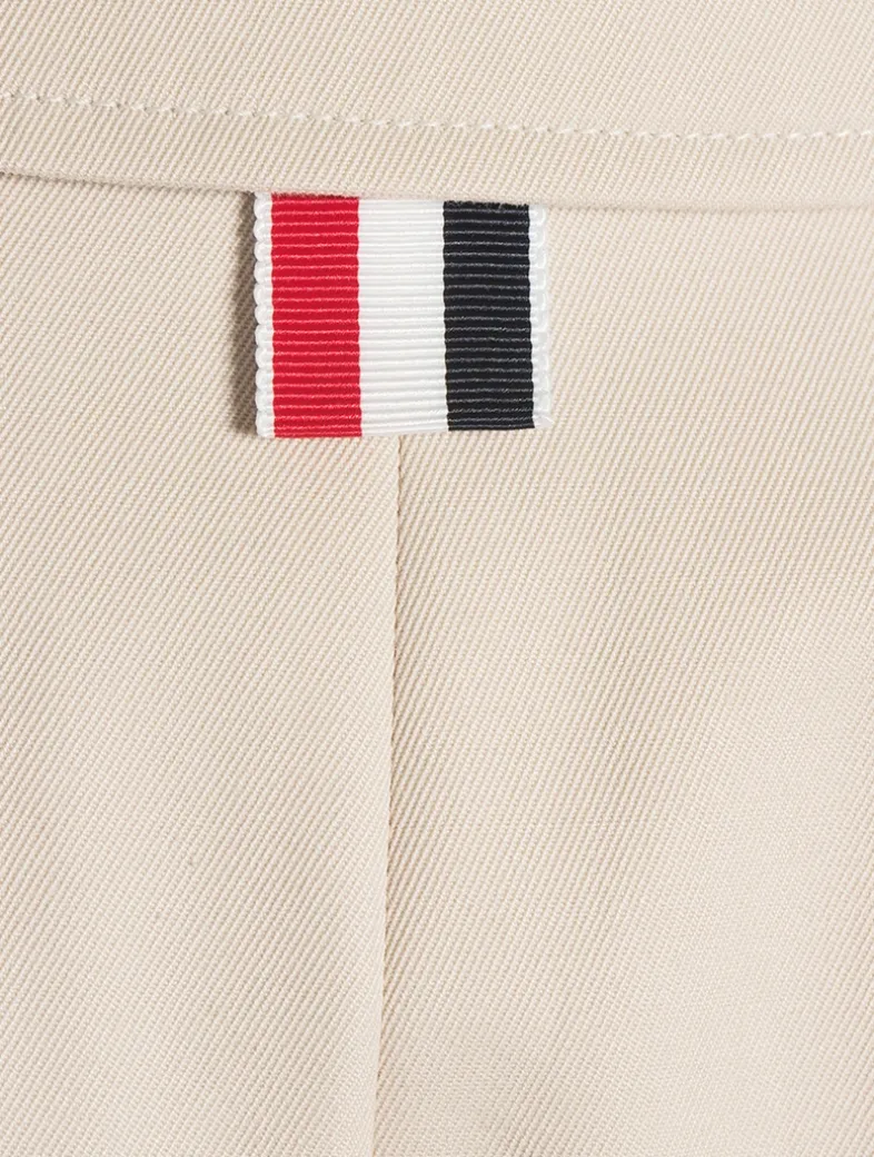 Flaunting a waterproof cotton twill design, this trench is modernized with signature Thom Browne styling. It has a striped lining and adjustable striped trim at the cuffs. The single-breasted style is closed with a hidden button placket and a self-tie belt.