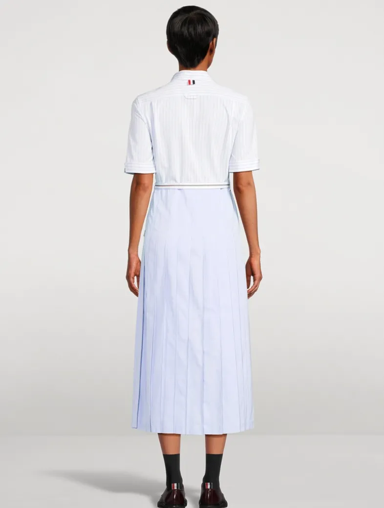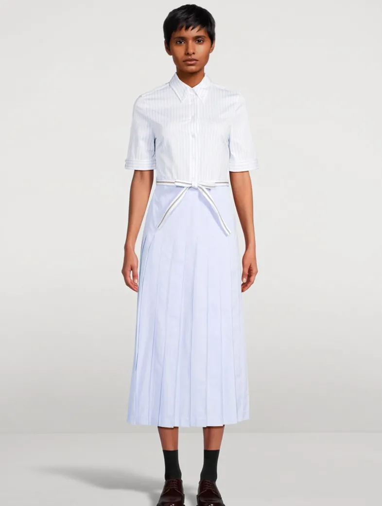 This classic shirt dress pairs a knee-length pleated skirt with a short-sleeve button-down shirt, creating a faux layered look. Crafted from cotton poplin, it is tailored to perfection and finished with a knotted bow belt.