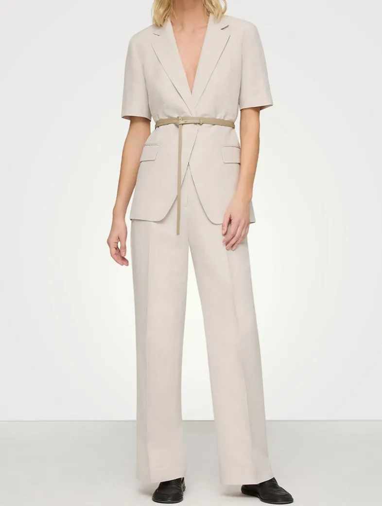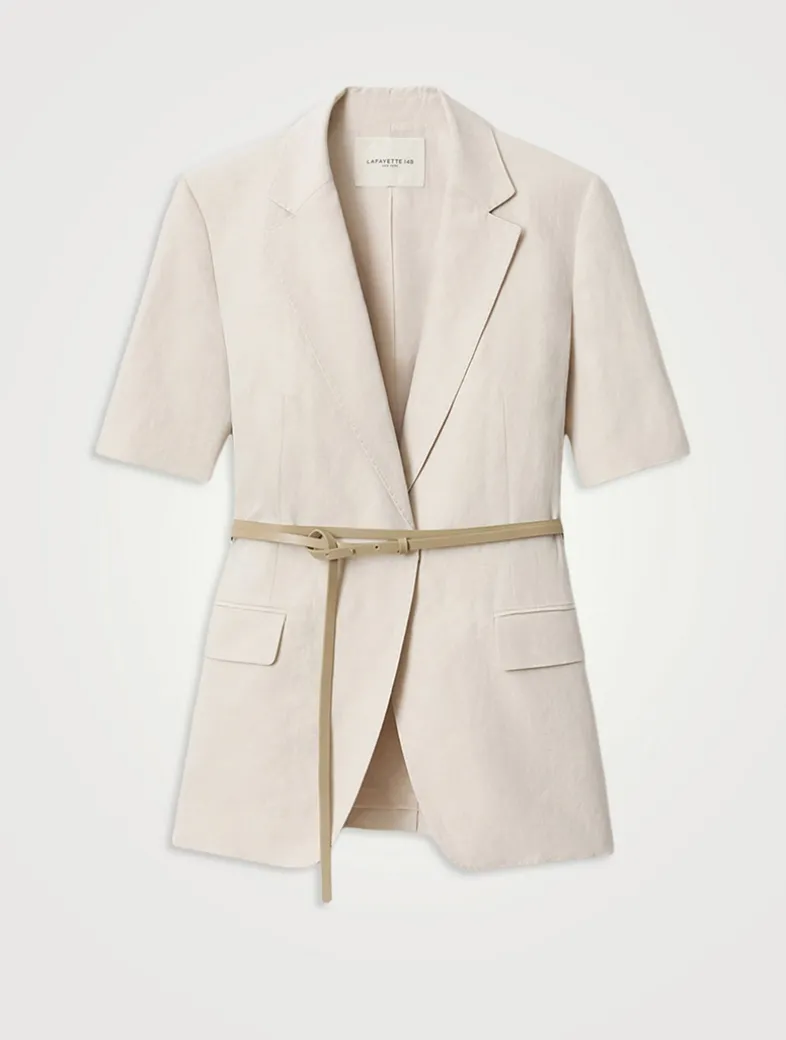 Signature silk-linen lends softness and structure to this short-sleeve cutaway blazer, shaped to a slim fit that tapers towards the hip, sculpted by darting and soft shoulders. It features a double-wrap leather belt for further definition.
